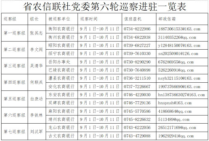 根据省农信联社党委关于巡察工作的统一安排部署,截至2025年9月2日,省农信联社党委第六轮巡察完成进驻工作,7个巡察组将对岳阳办事处,衡阳、衡州、昭阳、绥宁、巴陵、澧县、安化、东安、双牌、麻阳、靖州、龙山、古丈农商银行等14个单位开展常规巡察。