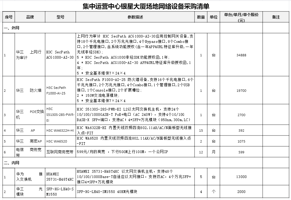 1、采购项目名称:集中运营中心场地网络设备采购项目。