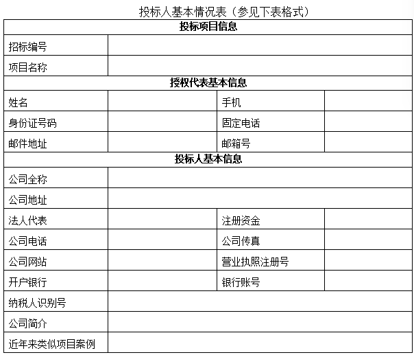 备注:外地或者本地不能来现场报名的投标人可以将“投标人基本情况表”完善后,连同“单位介绍信”、“标书款转账底单”一起扫描发送至,招标代理机构将及时办理报名登记。