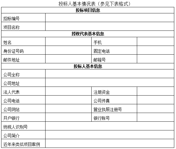 备注:外地或者本地不能来现场报名的投标人可以将“投标人基本情况表”完善后,连同“单位介绍信”、“标书款转账底单”一起扫描发送至,招标代理机构将及时办理报名登记。