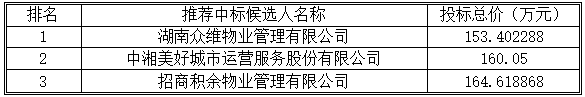 湖南国联招标有限公司受湖南省农村信用社联合社的委托,对湖南省农村信用社联合社集中运营中心物业服务外包项目(招标编号:0646-264hngln0051)所需服务进行国内公开招标。本项目的招标采购讯息于2026年2月27日在“中国招投标公共服务平台”(http://www.cebpubservice.com/)、“湖南省农村信用社联合社凯发平台k8官网”(http://www.hnnxs.com)上发布。开标仪式于2026年3月20日上午9:30(北京时间)在长沙市开福区黄兴北路112号华润置地中心2号栋45楼湖南国联招标有限公司开标,随后进行评标。评标委员会成员经过认真、仔细的评议,并提出评标报告,推荐的中标候选人排序如下: