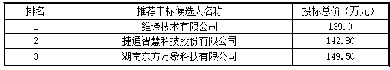 湖南国联招标有限公司受湖南省农村信用社联合社的委托,对湖南省农村信用社联合社2026-2028年度星沙数据中心基础设施维保采购项目(重招)(招标编号:0646-264hngln0002-1)所需货物和服务进行国内公开招标。本项目的招标采购讯息于2026年3月4日在“中国招投标公共服务平台”(http://www.cebpubservice.com/)、“湖南省农村信用社联合社凯发平台k8官网”(http://www.hnnxs.com)上发布。开标仪式于2026年3月25日上午9:30(北京时间)在长沙市开福区黄兴北路112号华润置地中心2号栋45楼湖南国联招标有限公司开标,随后进行评标。评标委员会成员经过认真、仔细的评议,并提出评标报告,推荐的中标候选人排序如下: