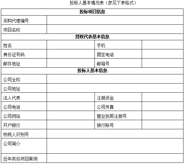 3.获取磋商文件时应提供的资料:①单位介绍信、②法定代表人身份证明及本人身份证原件、③授权委托书(附法定代表人身份证明)、④被授权人身份证原件、⑤“投标人基本情况表”,如为法定代表人持①、②、⑤获取文件,被授权人持①、③、④、⑤获取文件。